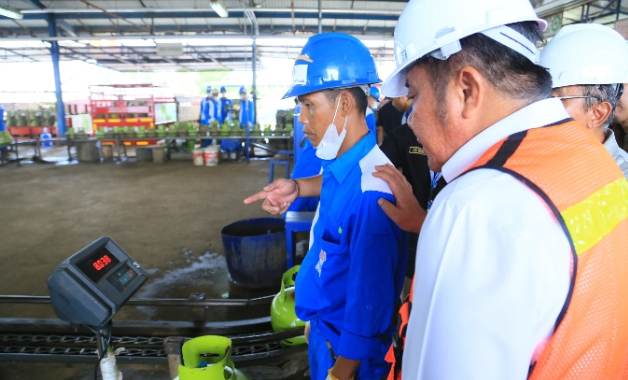 Dalam kunjungannya, Gubernur Herman Deru meninjau langsung proses pengisian tabung gas, mulai dari tahap penimbangan hingga pengamanan tabung.