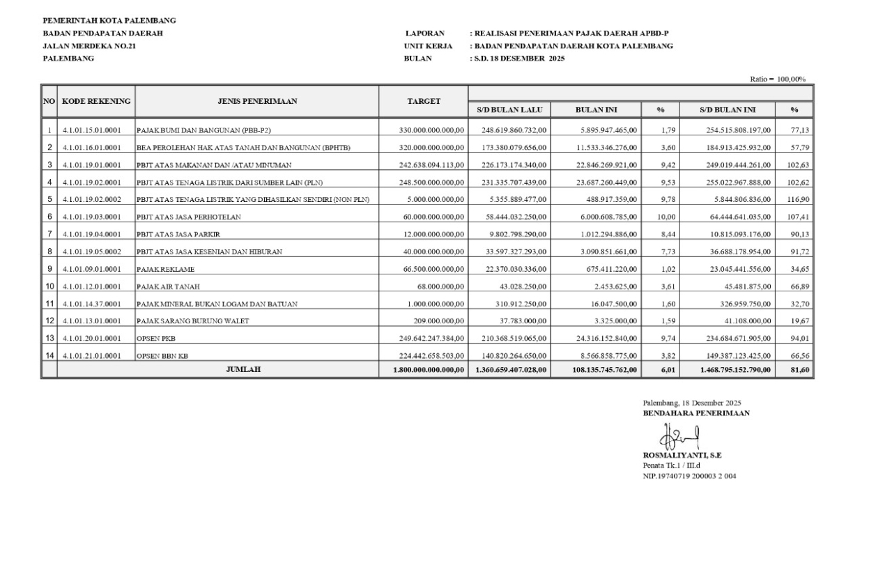 Berdasarkan data terbaru per 18 Desember 2025, total realisasi penerimaan pajak daerah baru terealisasi 81,60 Persen atau Rp 1.468.795.152.790 dari target Rp 1,8 Triliun.