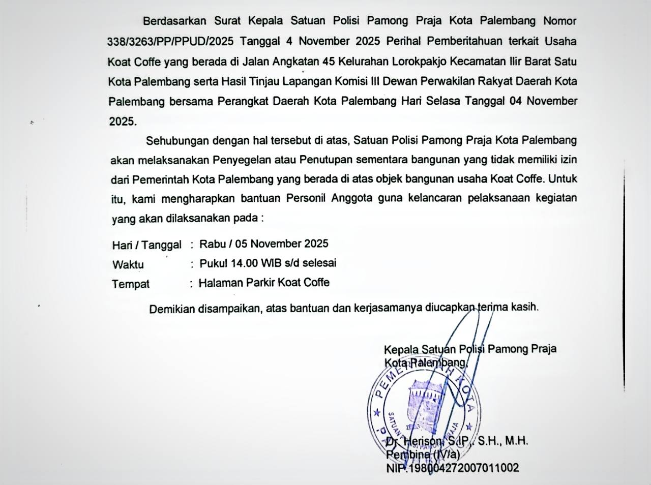 Diketahui, penyegelan itu tertuang dalam Surat Kasatpol PP Palembang, Nomor: 338/330/SPP/PPLID/2025, tertanggal 4 November 2025 Perihal Pemberitahuan terkait Usaha Komersil yang berdiri di atas Tanah Hasil Kesepakatan Komisi III Dewan Perwakilan Rakyat Daerah Kota Palembang serta Hasil Tindak Lanjut Laporan Komisi III Dewan Perwakilan Rakyat Daerah Tanggal 4 November 2025.