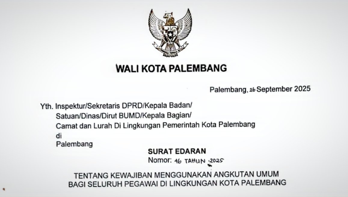 Kebijakan ini tertuang dalam Surat Edaran Wali Kota Palembang Nomor: 46 Tahun 2025 tentang Kewajiban Penggunaan Angkutan Umum bagi Seluruh Pegawai di lingkungan Pemkot Palembang. Dimana aturan ini harus dilaksanakan setiap Selasa pertama setiap bulannya.